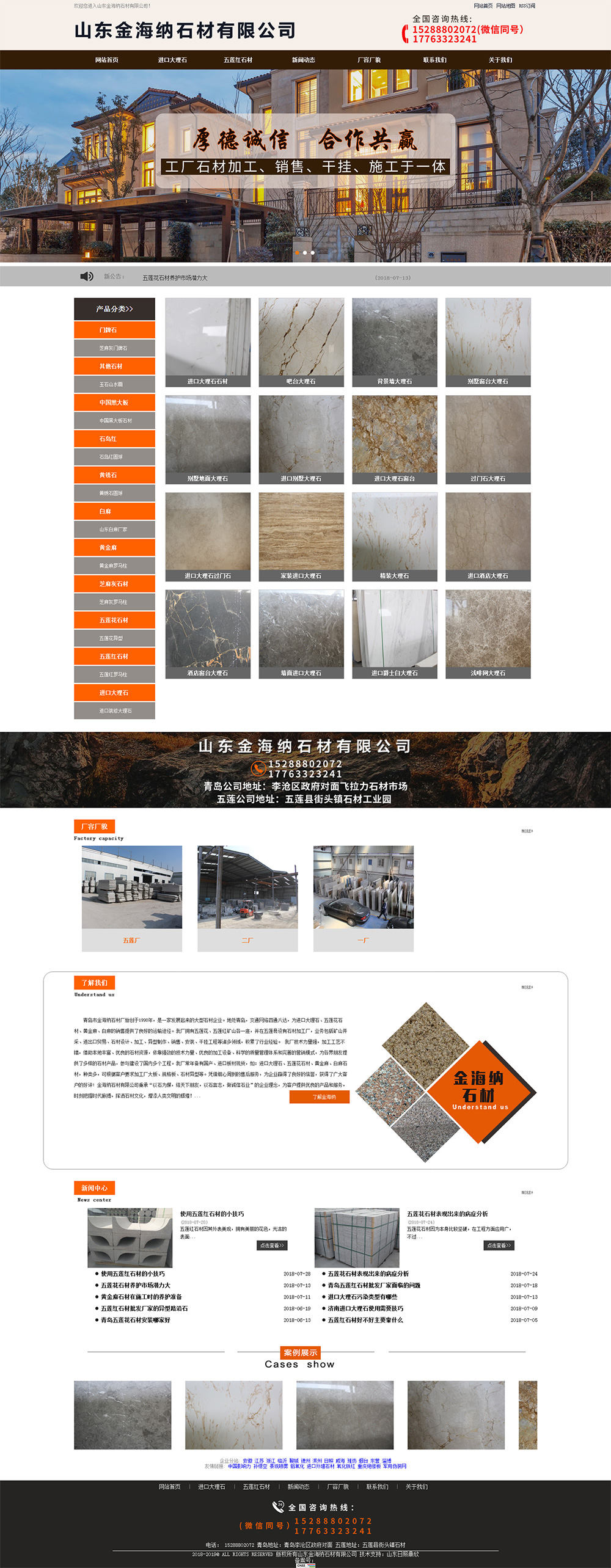 • 青島市金海納石材廠始 創(chuàng)于1998年,是一家發(fā)展起來的大型石材企業(yè)。地處青島,交通網(wǎng)絡四通八達,為進 口大理石、五蓮花石材、黃金麻、白麻的銷售提供了良好的運輸途徑。我廠擁 有五蓮花、五蓮紅礦山各一座,并在五蓮縣設有石材加工廠,業(yè)務包括礦山開采、進出口貿易、石材設計、加工、異型制作、銷售、安裝、干掛工程等諸多領域,積累了行業(yè)經(jīng)驗。 我廠技 術力量強,加工工藝不錯,借助本地優(yōu)良的石材資源,依靠強勁的技 術力量、優(yōu)良的加工設備、科學的質量管理體系和完善的營銷模式,為各界朋友提供了多樣的石材產(chǎn)品,參與建設了國