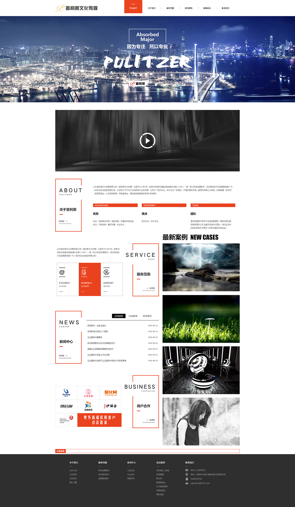 • v山東普利策文化傳媒有限公司(普利策文化傳媒)注冊于2013年7月,前身為日照永 恒盛世高 端婚禮定制(2008)。是一家以影視拍攝制作,活動策劃執(zhí)行及品牌營銷推廣為一體的綜合性新型傳媒公司。公司下置:策劃部,市場部,影視部及設計部四個部門。注冊3年來,致力于文化產業(yè)和影視產業(yè)的發(fā)展,公司以“因為專 注,所以專 業(yè)”的理念,嚴謹負責的態(tài)度,獲得了廣大 客戶的贊許和好評。